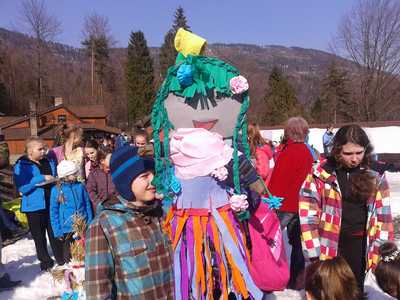W dniu 21 marca uczniowie szkolnego koła turystycznego wybrali się do Łodygowic i Szczyrku. W trakcie wycieczki poznaliśmy najcenniejsze obiekty Łodygowic. Uczestnicy wzięli udział w grze terenowej o nazwie Questing polegającej na odkrywaniu dziedzictwa miejsca i tworzeniu nieoznakowanych szlaków, którymi można wędrować, kierując się informacjami zawartymi w wierszowanych wskazówkach. Zwiedziliśmy zabytkowy kościół z XVII w. pw. św.św. Szymona i Judy Tadeusza - perłę drewnianego budownictwa sakralnego na Żywiecczyźnie oraz Izbę Regionalną zlokalizowaną w zabytkowym pałacu, w której znajduje się zbiór starych mebli, sprzętów domowych i gospodarczych oraz inne cenne eksponaty związane z historią okolicznych miejscowości. W Szczyrku spotkaliśmy się z charyzmatycznym księdzem Janem Byrtem, ewangelistą. Odpoczywaliśmy w schronisku Chata Wuja Toma, które jest drewnianą, stylową chatą góralską, pochodzącą z 1918 r., a znajdującą się na Przełęczy Karkoszczonka (736 m n.p.m.), tam też została spalona nasza marzanna.