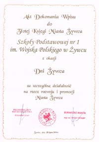 Szkoła Podstawowa nr 1 w Żywcu uhonorowana wpisem do Złotej Księgi Miasta Żywca!